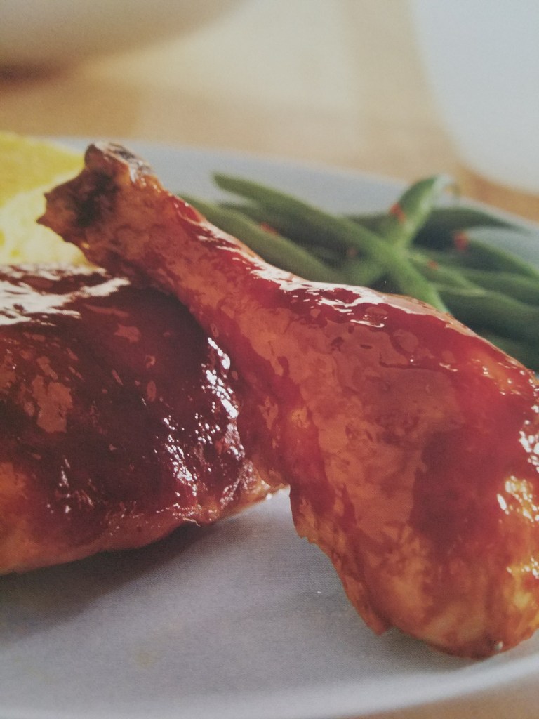 Preheat oven to 350 degrees F. Grease a 13×9-inch baking dish. Combine barbecue sauce, honey, soy sauce, ginger and mustard in a small bowl; mix well. Place chicken in prepared baking dish. Brush evenly with sauce mixture. Bake 45 minutes or untill cooked through, brushing occasionally with sauce. Makes 4 to 6 servings.