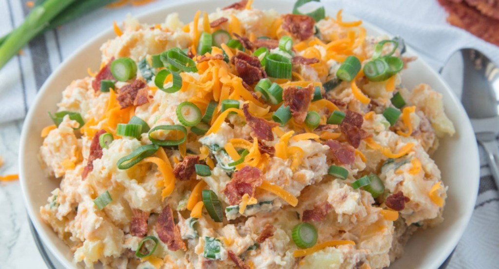 3. Mix the Mayonnaise and Sour Cream together in a bowl, add potatoes. Then, add bacon, onion, chives, cheese and salt and pepper then, mix together well.